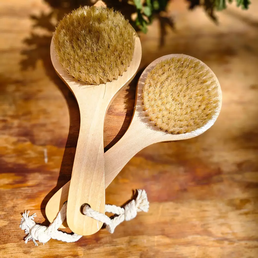 Cepillo compacto para uso diario en la ducha. Su forma ergonómica y cerdas de sisal ayudan a limpiar y exfoliar suavemente la piel.