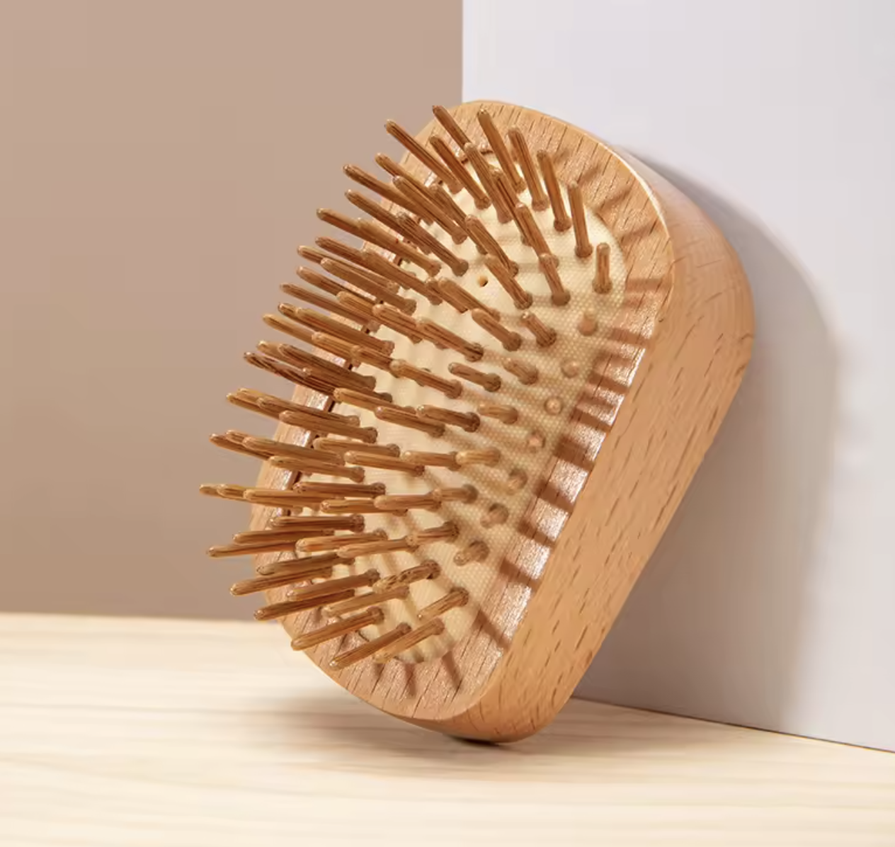 Cepillo de bambú compacto, sin mango, ideal para estilizar y desenredar el cabello de forma suave y natural.