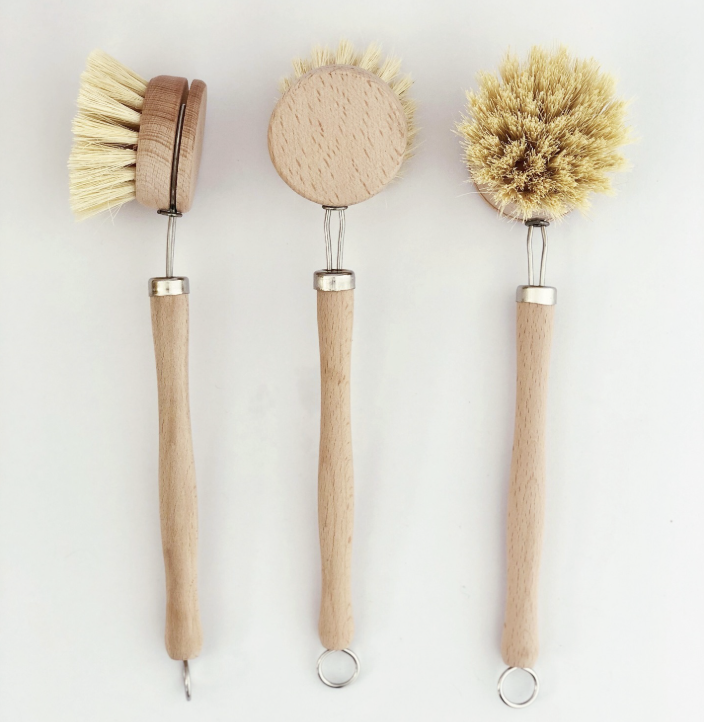 Cepillo de madera con mango ergonómico y cabezal intercambiable de fibra de coco. Permite lavar utensilios sin esfuerzo y con precisión.