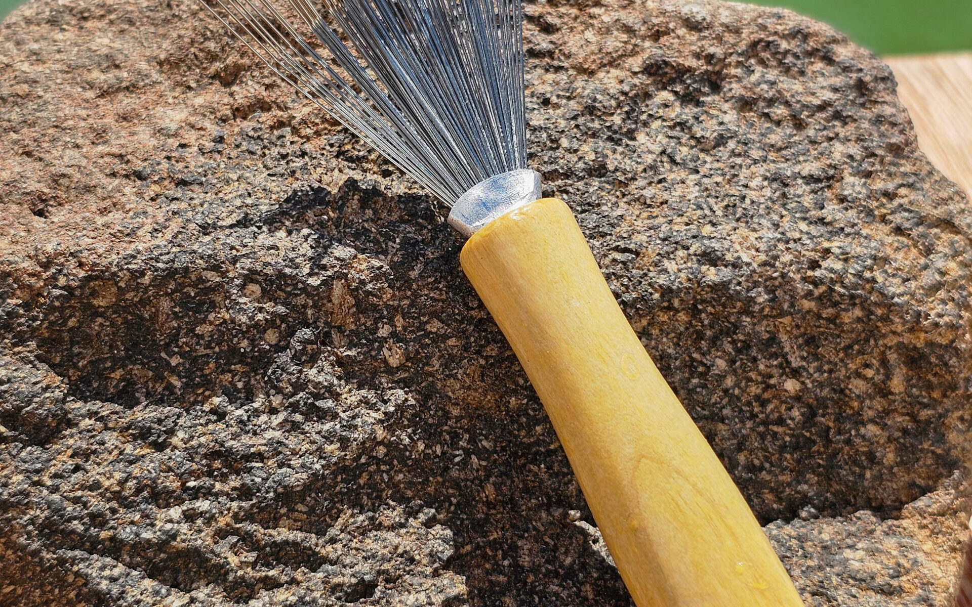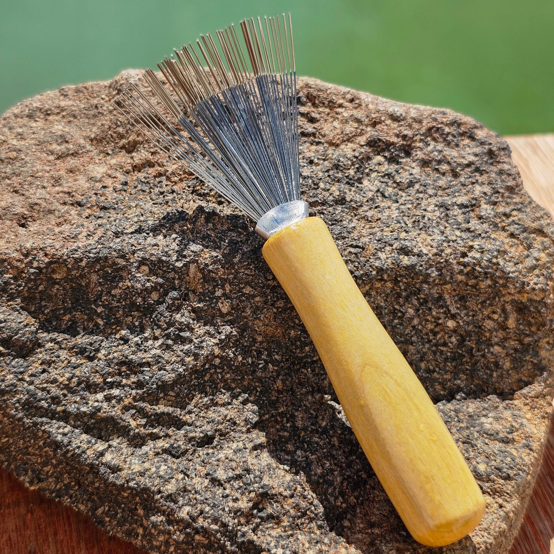 Herramienta de madera con púas metálicas para limpiar cepillos de cabello. Elimina cabello y residuos acumulados con facilidad.