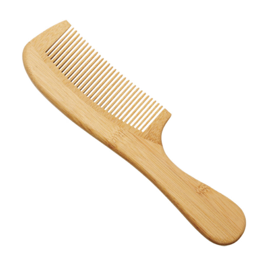 Peine de bambú con mango ergonómico, ideal para desenredar cabello lacio o ligeramente ondulado sin maltratar la fibra capilar.