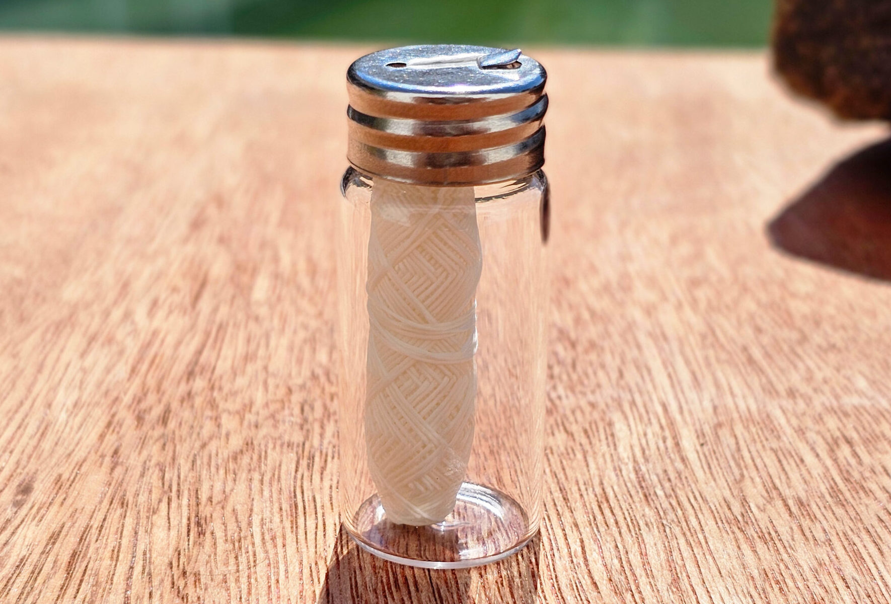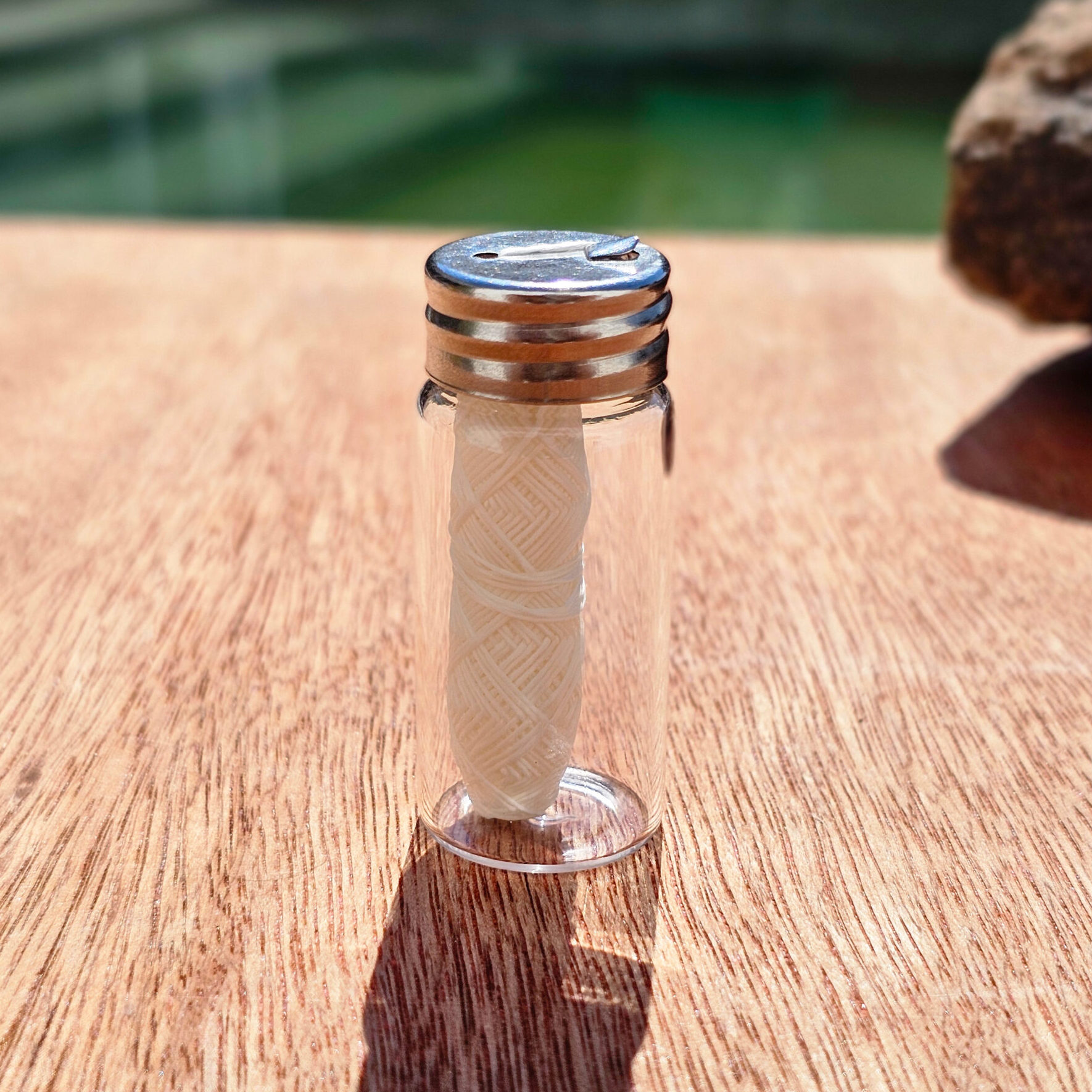 Frasco de vidrio resistente y elegante para almacenar hilo dental. Ideal para una rutina sin residuos y visualmente limpio + Hilo dental ecológico elaborado con fibra de bambú. Suave, resistente y libre de plásticos, ideal para el cuidado bucal diario.
